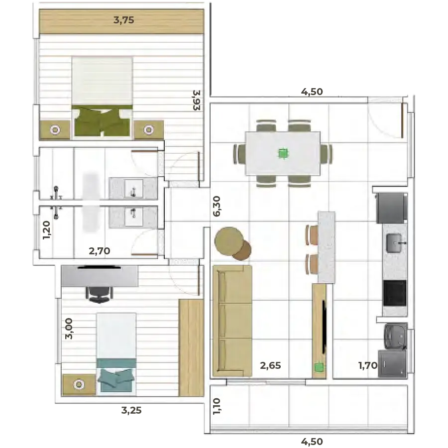 Dois quartos sendo 01 suíte, generoso espaço para armários, sala para 2 ambientes Varanda Cozinha americana